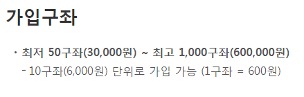 최소 3만원에서 최고 60만원까지 10구좌(6000원)단위로 가입가능합니당